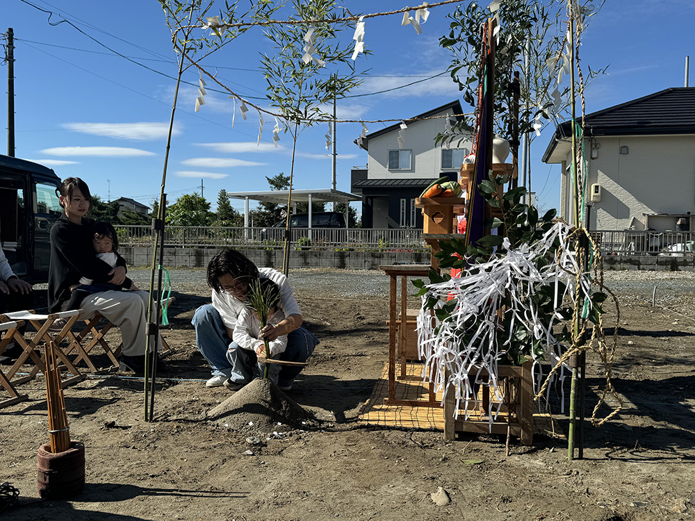 地鎮祭のメインイベントである鍬入れの儀にM様にご参加していただきました。