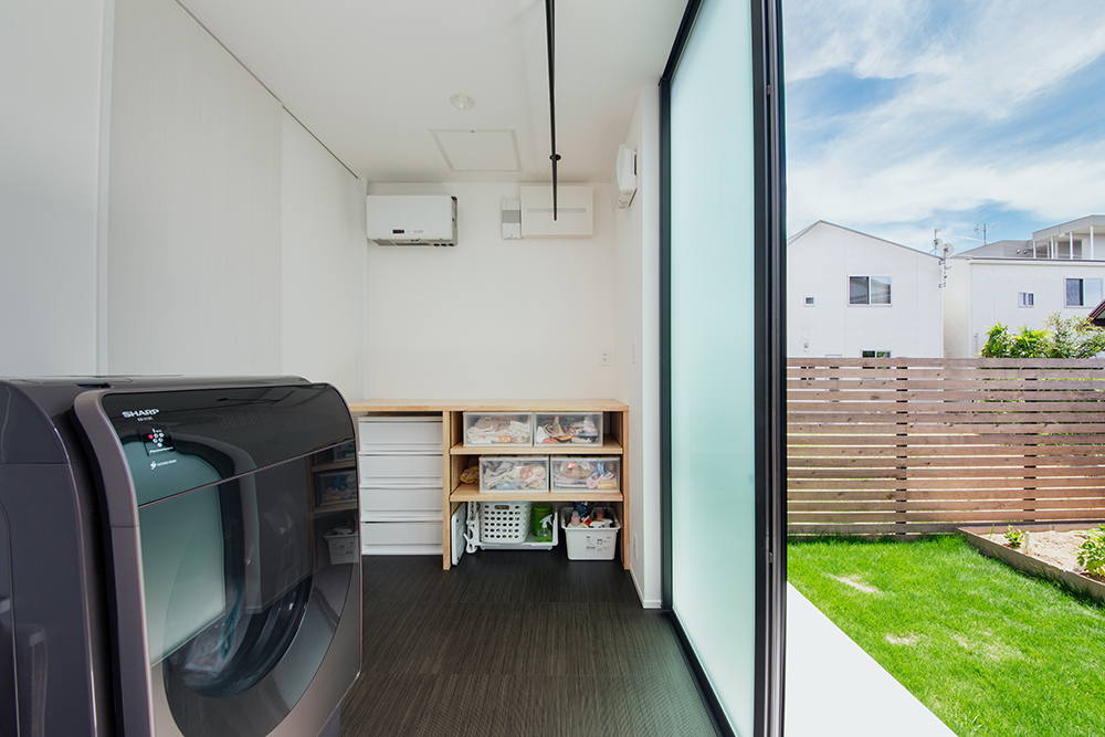 部屋干し出来るランドリールームからテラスデッキ、庭へと直結する動線。広いランドリールーム兼脱衣室は、子育て夫婦の気持ちにゆとりをもたらしてくれます。