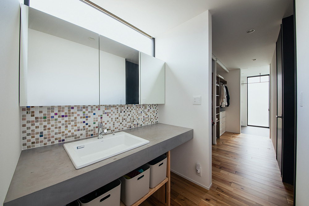 大型の造作ミラーを備えた洗面コーナー。すぐ横には壁一面のファミリークローゼット、さらに脱衣室兼ランドリールーム、浴室へと繋がって行きます。