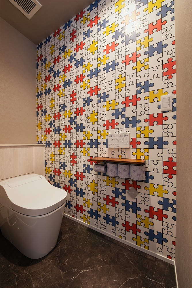 パズル模様のデザインクロスを一面に貼ったトイレ。遊び心ある空間に仕上がりました。