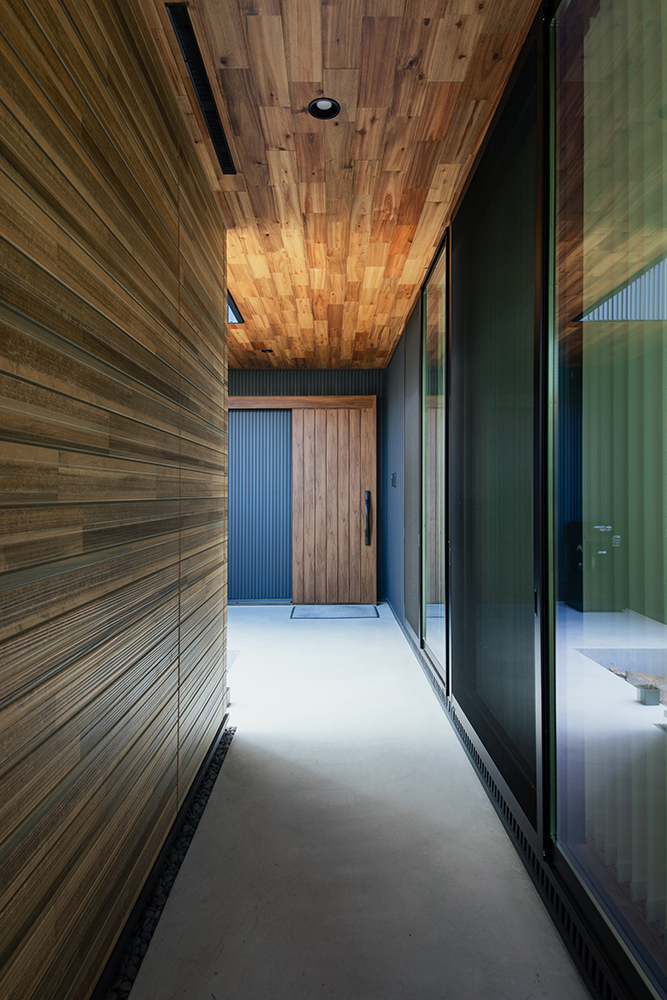 無垢のアカシアを贅沢に使ったポーチ。天井の木が室内のダイニングキッチンまで続くように設計しました。軒を深く伸ばした事で、駐車場から玄関までほとんど濡れずにアクセス出来ます。