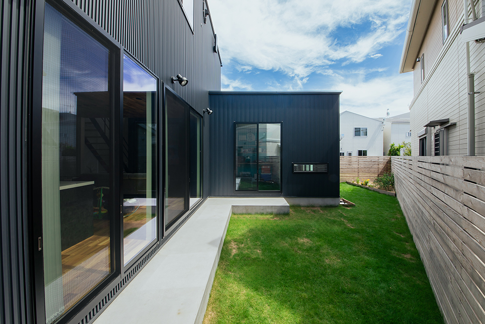 ブラックのガルバリウムと木調の壁が絶妙のバランスで融合し、美しい佇まいを見せています。洋の外観と和の植栽とのコントラストも良いです。