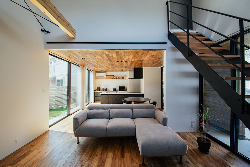 吹抜けと天井まで届く大開口を実現したLDK。キッチンから目が届く位置にスケルトンのリビング階段を設けました。