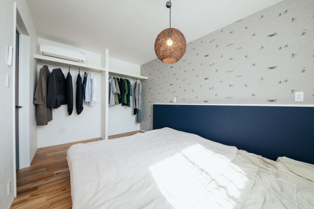 2階の一番日当りの良い場所に主寝室を配置しました。お気に入りのキャラクターのクロスを貼って、空間に遊び心を持たせました。