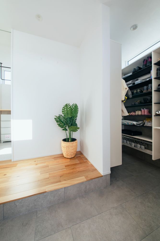 シンプルにスッキリと仕上げた土間玄関。大容量のシューズクローゼットを完備しました。水回りとリビングへの2方向にアクセス出来ます。
