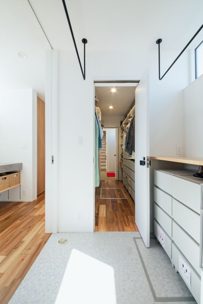 玄関から脱衣室、ファミリークローゼット、畳コーナー、LDKへと行き止まり無しで繋がる家事ラク動線。