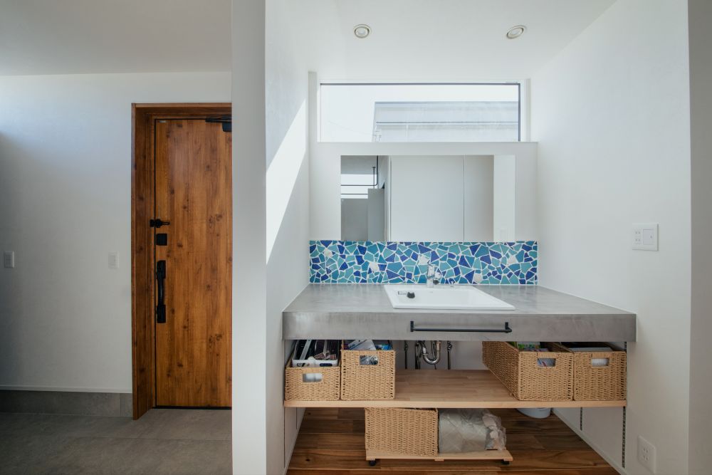 玄関ホールに設置した、ただいま手洗いコーナー。造作の洗面台は水に強い「デコリエ」で仕上げました。海をイメージしたブルーのタイルとの相性もバッチリです。