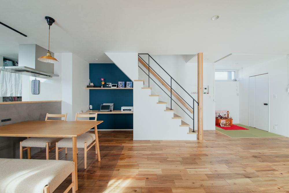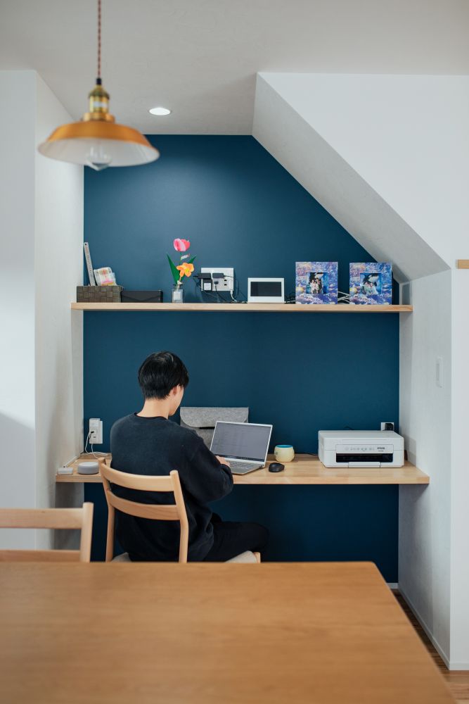 ダイニングの後ろに設けたワークスペース。将来的に子どものスタディコーナーとして使う予定。キッチンに立つパパ・ママに見守られ、安心して勉強出来そうです。