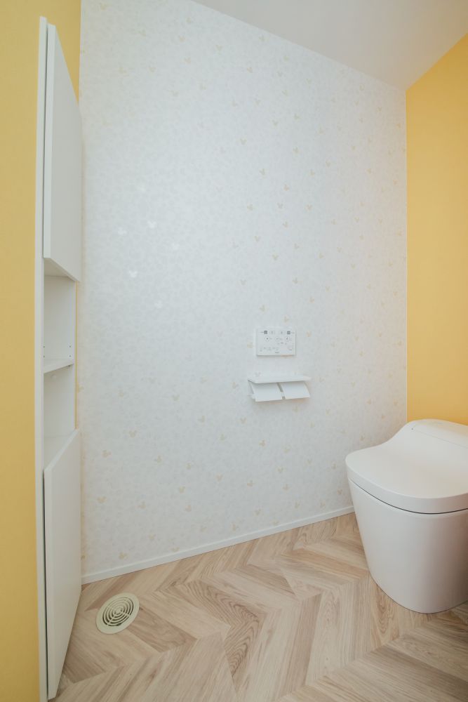 1階のトイレは、ヘリンボーン柄のフロアと黄色のクロスで明るく優しい雰囲気になり、リラックス出来る空間になっています。