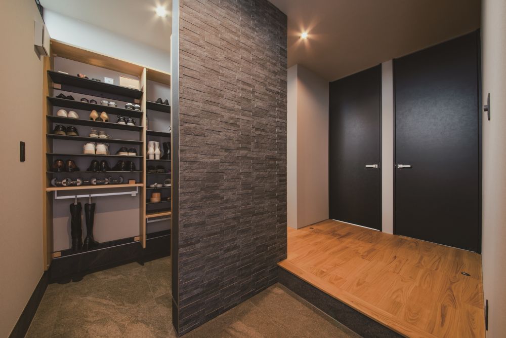 玄関とシューズクロークとの間の壁にタイルを貼り高級感をUP.