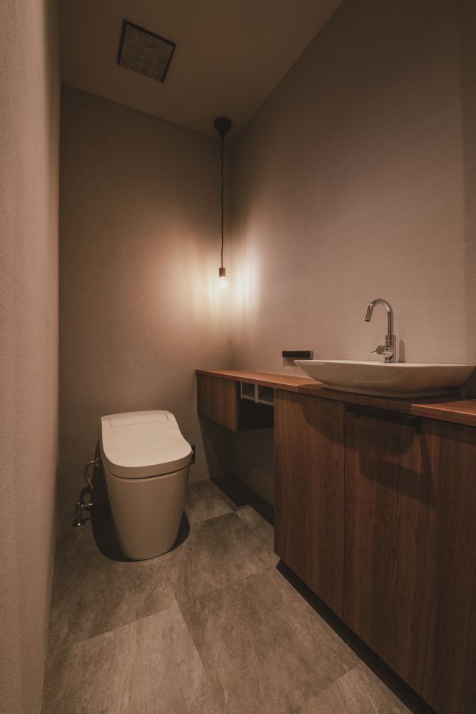 トイレの壁は消臭効果に優れた薩摩中霧島壁を採用。消臭剤が要らないほど効果が高く、塗り壁の質感も良いです。