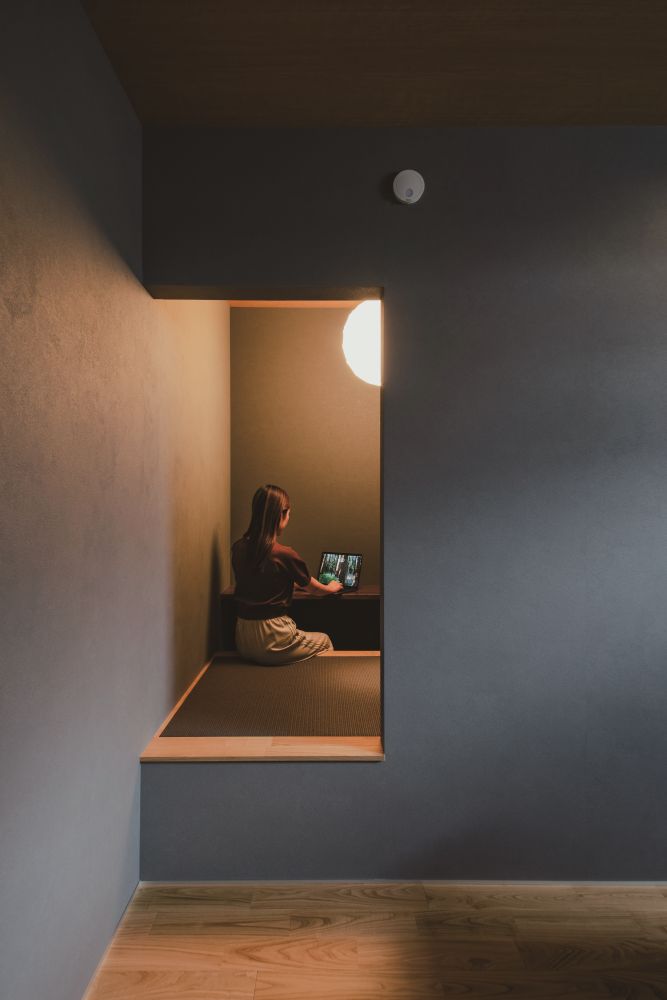 主寝室の一角に設けた小上がりの書斎。L字のカウンターと掘りごたつの畳スタイルで、こもり感を味わいながらプライベートを楽しめます。