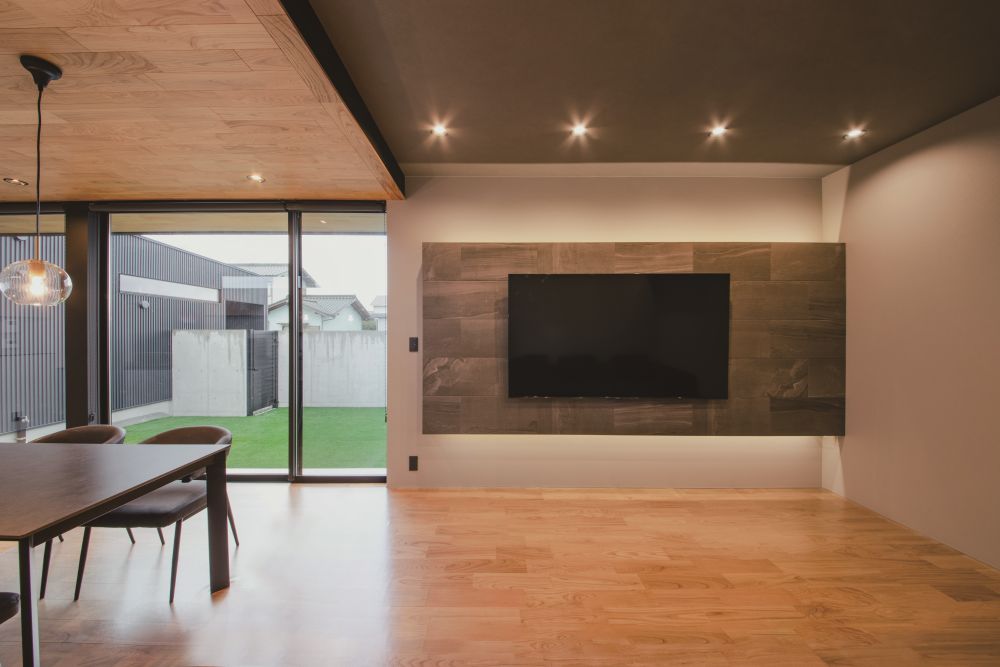 TVと一体化した壁はタイルで高級感をUP。天井高も変え空間のメリハリもアクセントにしています。